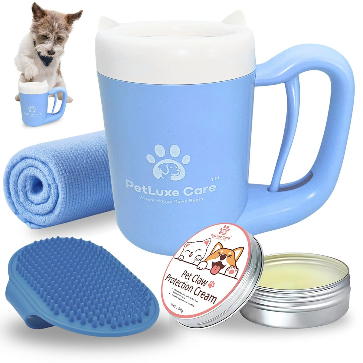 Get everything you need for complete paw hygiene: paw washer cup, microfiber drying towel, silicone grooming brush, and a natural moisturizing paw balm. Compact and lightweight for home or travel—keep muddy prints off floors, furniture, and car seats.