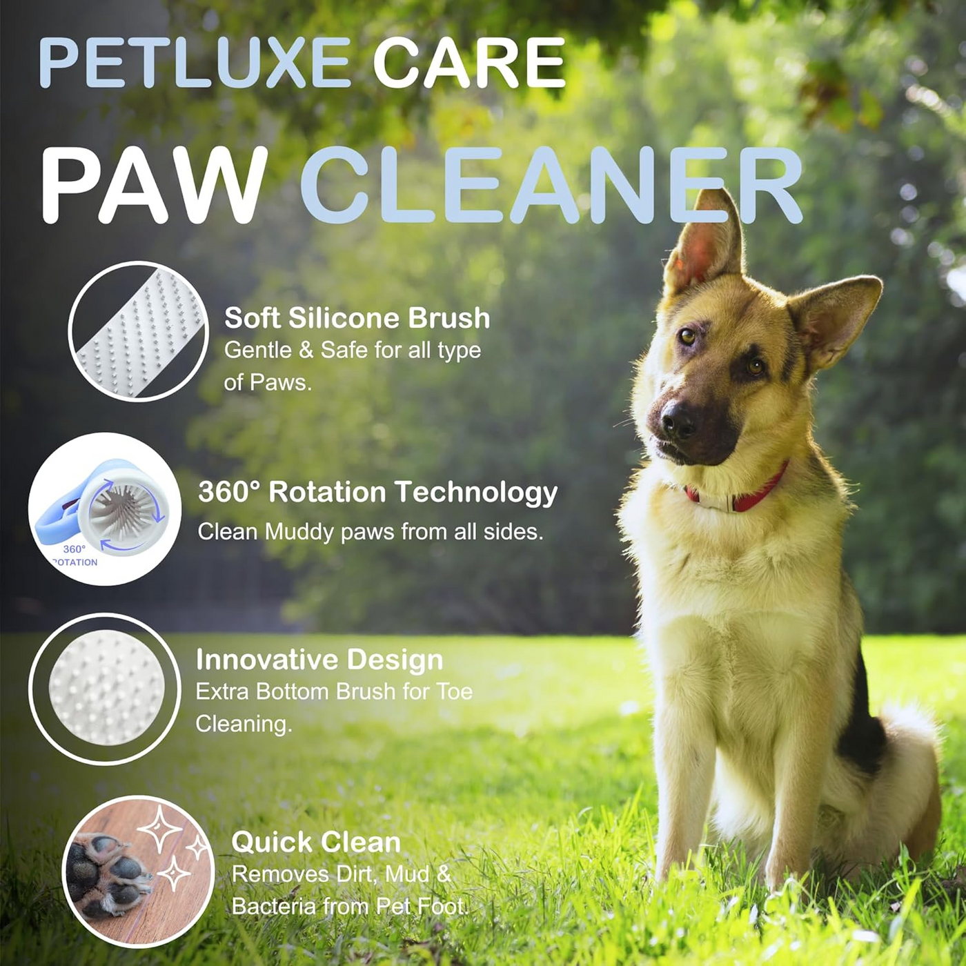 Say goodbye to messy paw prints with the PetLuxe Care Ultimate Paw Care Kit. The semi-automatic pull-and-clean design rotates soft silicone bristles 360° to lift dirt, mud, and debris in seconds. No bending, twisting, or scrubbing—just quick, comfortable cleaning that makes your pup’s paws shine.