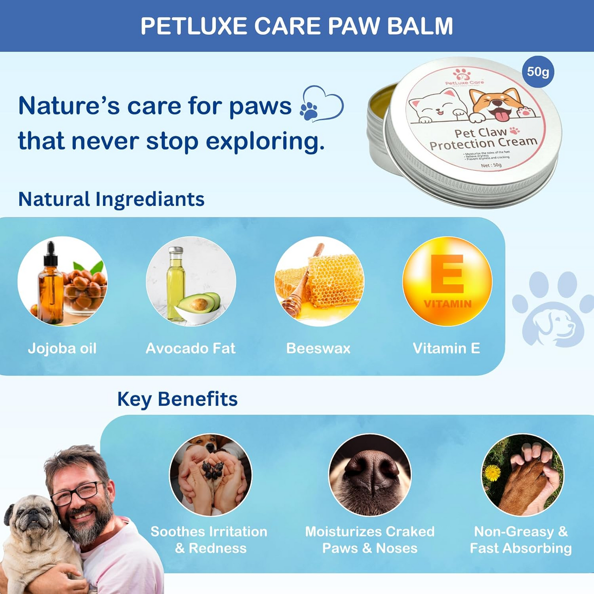 Our natural formula includes jojoba oil, avocado fat, beeswax, and vitamin E, safe and effective for dogs.