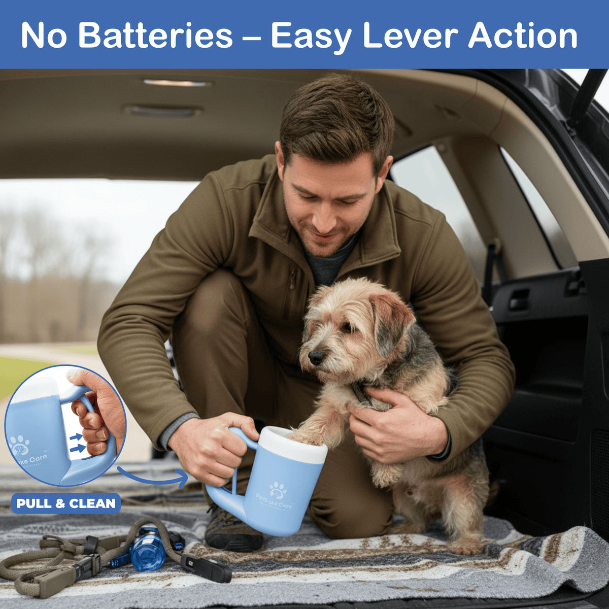 Simply add water, insert your dog’s paw, and pull the lever. The 360° rotating silicone bristles gently scrub away dirt and mud without twisting or batteries.